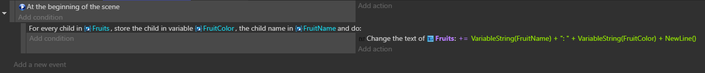 This event stores the value of each child variable (as a string or number) and the name of the child variable (as a string) into variables you specify in the parameters of the event. You can use either scene variables or local variables for the variable to iterate on, for the variable storing the child value, and for the optional variable storing the child name.
