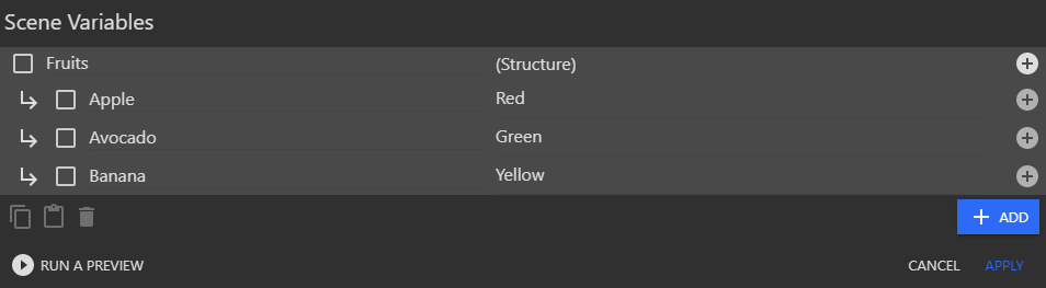 • Define a structure variable (Fruits) with multiple child variables (Apple, Avocado, Banana)