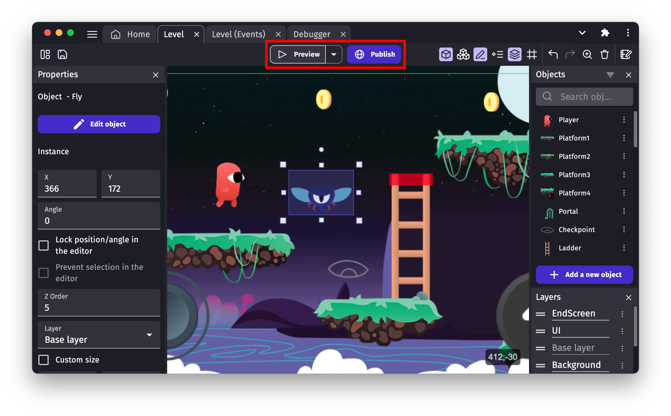 A Preview button is available in the toolbar. This button launches a preview of your game in a new window.